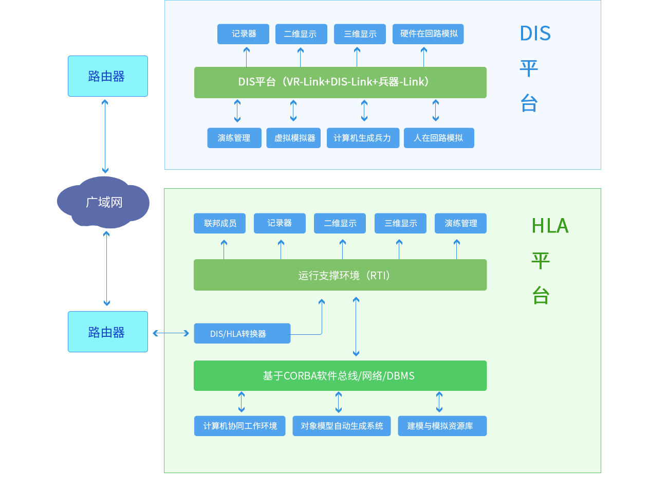 研究先進(jìn)的仿真技術(shù)和方法,采用DIS、HLA、DDS、VR、VP及CGF等技術(shù)研制多款武器裝備配套的多功能和全任務(wù)模擬訓(xùn)練器/系統(tǒng)平臺,聯(lián)合作戰(zhàn)模擬訓(xùn)練和多武器仿真平臺的模擬訓(xùn)練器/系統(tǒng)的新型混合體系結(jié)構(gòu)示意圖。